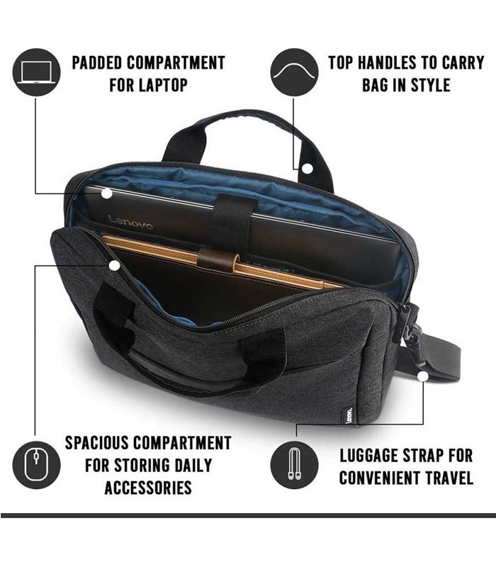 The Lenovo 15.6″ Laptop Casual Toploader T210 combines water-repellent fabric with a clean, streamlined design to create a laptop case that is perfectly suited to modern life. It offers an integrated laptop compartment which comfortably fits most laptops up to 15.6-in. A range of internal pockets for those must-have accessories, and a spacious main compartment books and other items. Casual and stylish design; High quality, durable and water repellant fabric; Large storage capacity ? fits up to 15.6? laptops; Conveniently placed compartments and pockets; Integrated luggage strap for more convenient travel
